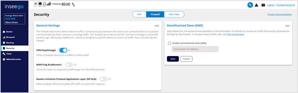The FX4100 firewall determines which internet traffic is allowed to pass between your router and connected devices and protects your connected devices from malicious incoming traffic from the internet. The firewall cannot be turned off. Use the Firewall tab to allow VPN Passthrough, enable WAN ping requests, and/or enable SIP ALG to support older VoIP devices. You can also designate a specific device to receive all traffic (DMZ).