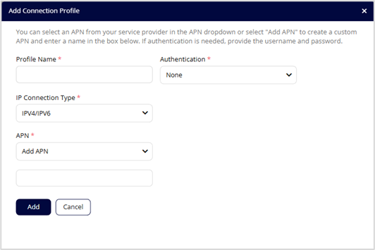 - APN: Select an APN supplied by your service provider from the dropdown or select Add APN and enter the APN for your private network in the text box that appears below.