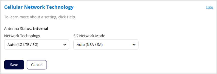 Network Technology: Your router is set to Auto (4G LTE/5G) by default, which prioritizes 5G but allows 4G and other non-5G technologies to be used. If you select 4G LTE or 5G from the dropdown, your router is restricted from connecting to networks not using that technology, for example, if you select 4G LTE, your router will be unable to connect to 5G networks.