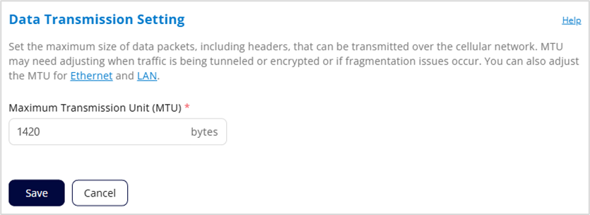 Use this section to set the maximum transmission unit (MTU) for the cellular network. This is the maximum size of data packets, including headers, that can be transmitted. You might want to adjust the MTU when traffic is being tunneled or encrypted, or if you are noticing fragmentation issues.