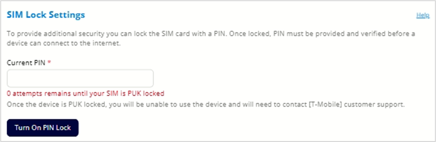 - Turn On PIN Lock - Sets the SIM so that entry of a PIN is required upon startup to connect to the mobile network. To perform this operation, you must enter the current PIN.