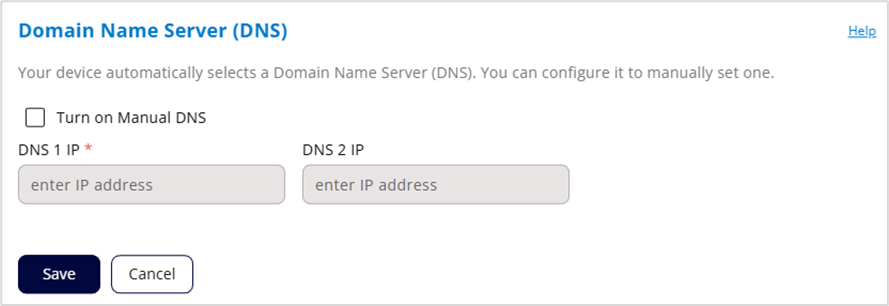 DNS 1 IP: Enter the IP address for the primary DNS. This address is required to use the Manual DNS feature.