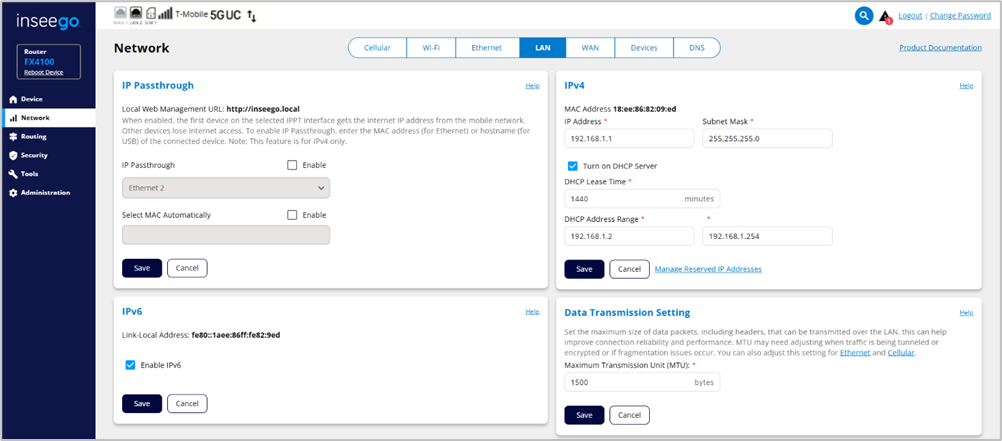 This tab provides settings and information about the FX4100 local area network (LAN). The LAN consists of the device and all connected devices.