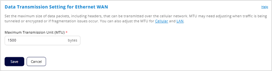 Use this section to set the maximum transmission unit (MTU) for your Ethernet WAN network. This is the maximum size of data packets, including headers, that can be transmitted. You might want to adjust the MTU when traffic is being tunneled or encrypted, or if you are noticing fragmentation issues.