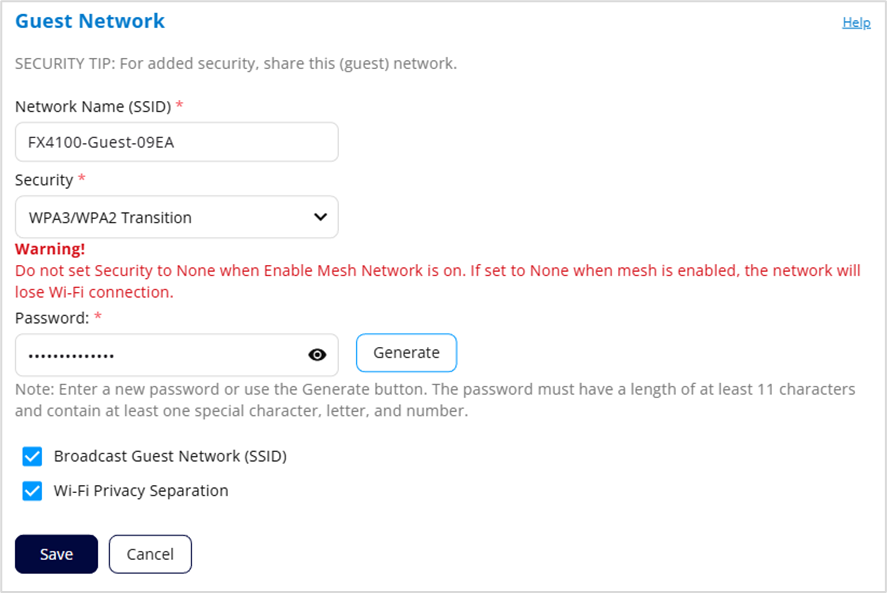 Broadcast Primary Network (SSID): This option is checked by default, allowing the Wi-Fi guest network to be displayed in the list of available Wi-Fi networks on connecting client devices. If you choose to uncheck this option, this network is not visible to connecting client devices.