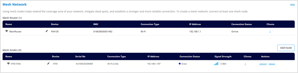 Actions: Click remove to remove the mesh node from your network. Click reboot to restart the mesh node.