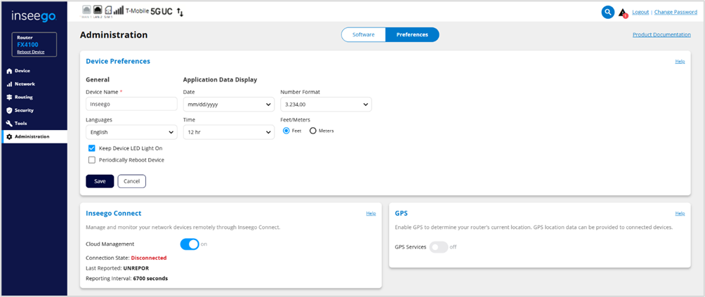 Use this tab to set device preferences such as language, enable/disable Inseego Connect, and enable GPS to view current device location information.