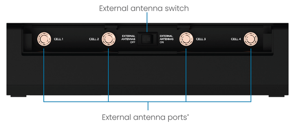 * When enabled, each external antenna port supports the full cellular frequency range of 0.6-6 GHz. To activate the external antenna ports, turn the switch to EXTERNAL ANTENNAS ON.