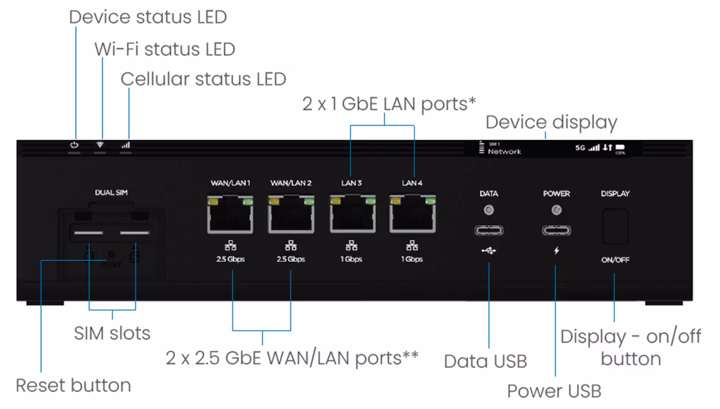 ** 2.5 GbE Ethernet ports can be configured as WAN or LAN in the admin web UI or Inseego Connect with Network > Ethernet.