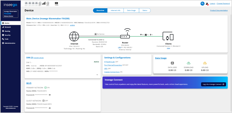 The Device Overview tab is the home page of the admin web UI. Use it to view information about your router at a glance. You can see an overview of your router and network, SIM information, common settings, data usage stats, and current Wi-Fi networks and passwords. Use the links to jump to a specific topic for more details and configuration options or navigate using the side menu.