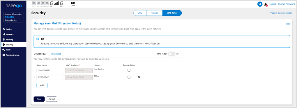 The MAC filter only allows selected devices to access the FX4200 network through DHCP. By default, MAC filter is turned off.