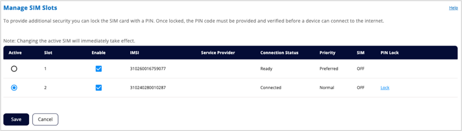 Use this section to manually switch between SIMs and lock or unlock SIMs. The SIM card in your router can be locked using a PIN. If the SIM card is locked, you must enter the PIN before connecting to the mobile network. Once entered, the PIN is remembered until the next shutdown. You may also need to provide the existing PIN to change a SIM. The default PIN is available from your service provider.