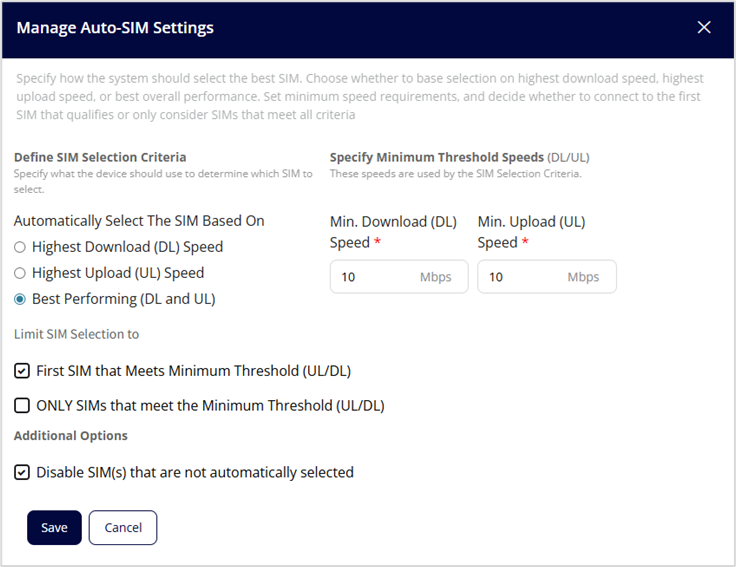 Set a minimum download speed and minimum upload speed at which a SIM can be automatically selected. Values must be between 1 and 2500 Mbps.