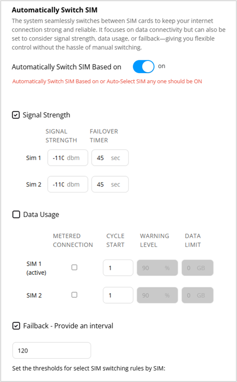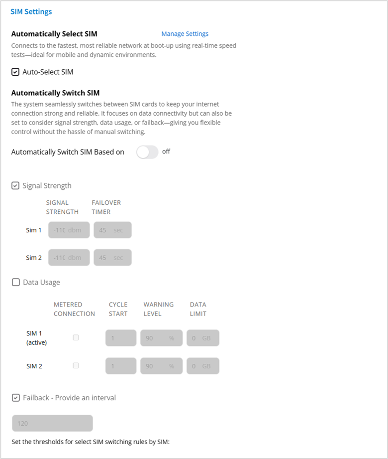 Failback: Check this checkbox to set the failback interval for SIM switching. Enter thenumber of seconds between failback verification attempts to check signal strength and/or data usage and switch back to the primary SIM when verified.