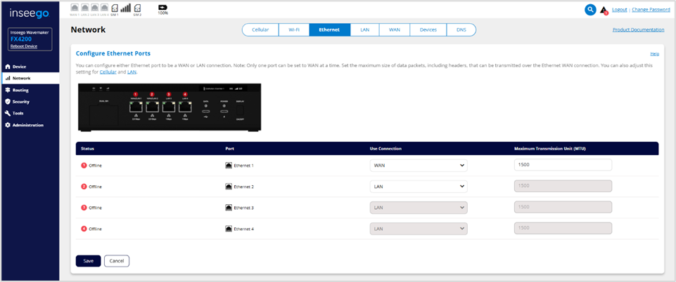 Use this tab to configure Ethernet ports. The two ports on the left are labeled as WAN/LAN on the FX4200, and you can set either of them to be a WAN or LAN connection.