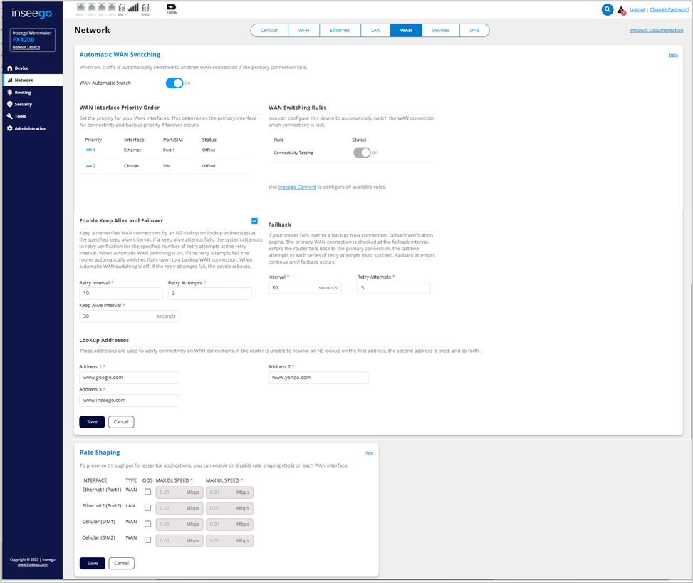 Use this tab to enable WAN automatic switching, set WAN priorities, configure health checks (keep alive, failover, failback, and lookup addresses), and enable rate shaping on WAN interfaces.