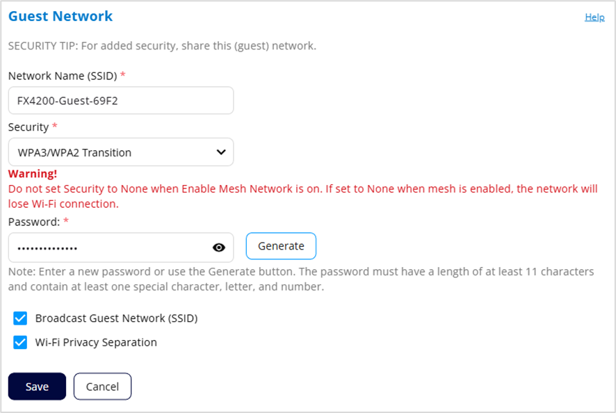 Broadcast Primary Network (SSID): This option is checked by default, allowing the Wi-Fi guest network to be displayed in the list of available Wi-Fi networks on connecting client devices. If you choose to uncheck this option, this network is not visible to connecting client devices.