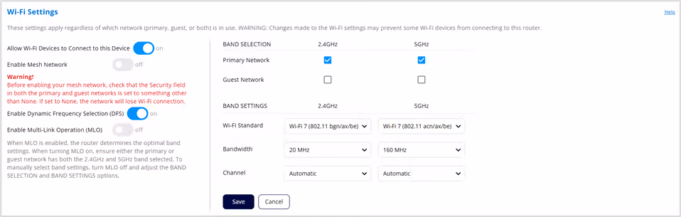 You can use this section to turn Wi-Fi off, enable a mesh network, turn off DFS, or disable MLO in order to select bands and band settings manually.