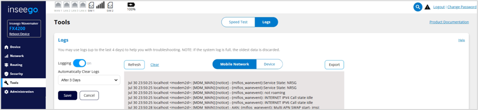 Mobile Network: Displayslog data of connections to the mobile network.